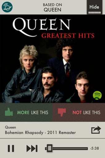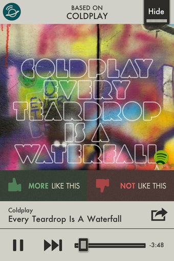 En principio, SpotON Radio muestra canciones afines a tus gustos, pero puedes afinar la puntería aprobando o rechazando las canciones a medida que las escuchas con los botones More like this y Not like this.